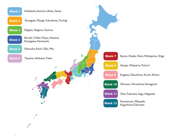 Japan is divided into 12 blocks. Each block has one representative who works to promote AJET within their prefectures, build relationships with the local AJET chapters and JETs, and plans/promotes events. Block representatives are voting positions within National AJET.